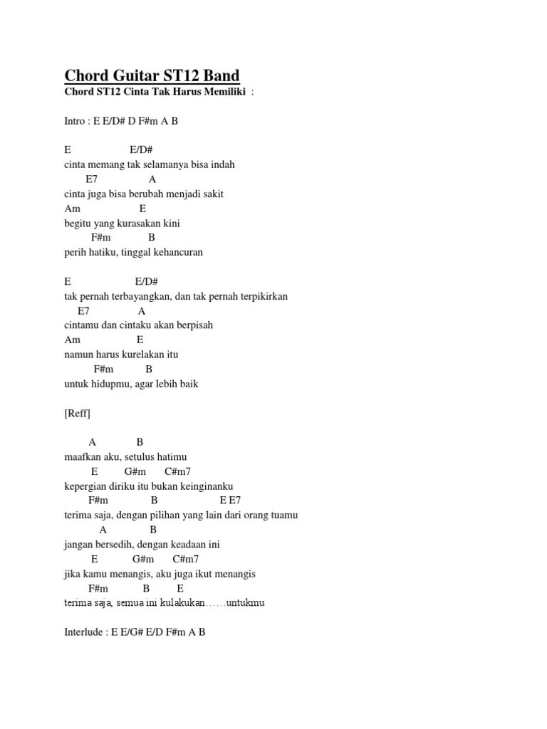 Gm am cinta juga bisa berubah. C em g a dm f g. Lagu yang dirilis pada tahun 2011 lalu ini masih legit sampai sekarang. 'cinta tak harus memiliki' adalah salah satu lagu andalan st!2. Capo di fret 4 (intro) c em gm am dm f g. Cinta juga bisa berubah jadi sakit. Chord setia band cinta tak harus memiliki. Lirik lagu cinta tak harus memiliki dari band st12. Lirik lagu cinta memang tak selamanya bisa indah cinta juga bisa berubah jadi sakit begitu yang ku rasakan kini perih hatiku tinggal kehancuran tak pernah . C em cinta memang tak selamanya bisa indah Download lagu setia band cinta tak harus mp3 dan mp4 di metrolagu. Lirik lagu setia band cinta tak . Kumpulan lagu setia band cinta tak harus full album.